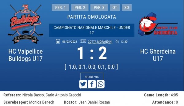 Nach einer langen Reise nach Torre Pellice machten sich sich die Grödner/Rittner das Spiel noch länger. Sie konnten sechs Überzahlspiele nicht nutzen, während Valpe schon mit dem ersten Powerplay den Führungstreffer setzen konnte. Erst in der Nachspielzeit (3 gegen 3 Spieler) gelang es die in der Vorrunde unbesiegten Bulldogs zu bezwingen. Im Siebten Powerplay (nun 4 gegen 3 Spieler) konnte Tobias Graf den Siegtreffer setzten. Erfreulich war auch, dass Torhüter Florian Plattner das Spiel von Anfang an bestreiten konnte.