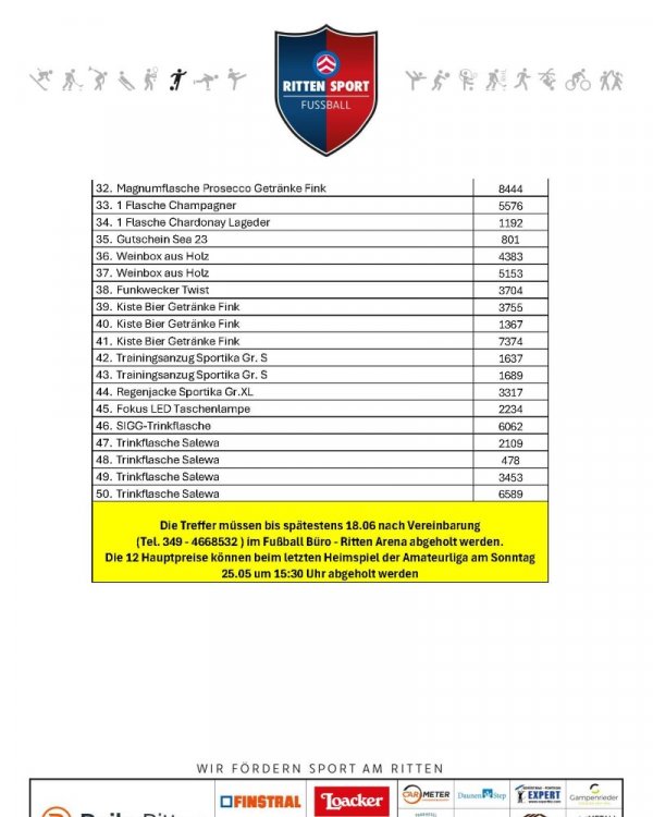 Die Treffer müssen bis spätestens 18.06 nach Vereinbarung (Tel. 349 - 4668532 ) im Fuball Büro - Ritten Arena abgeholt werden.